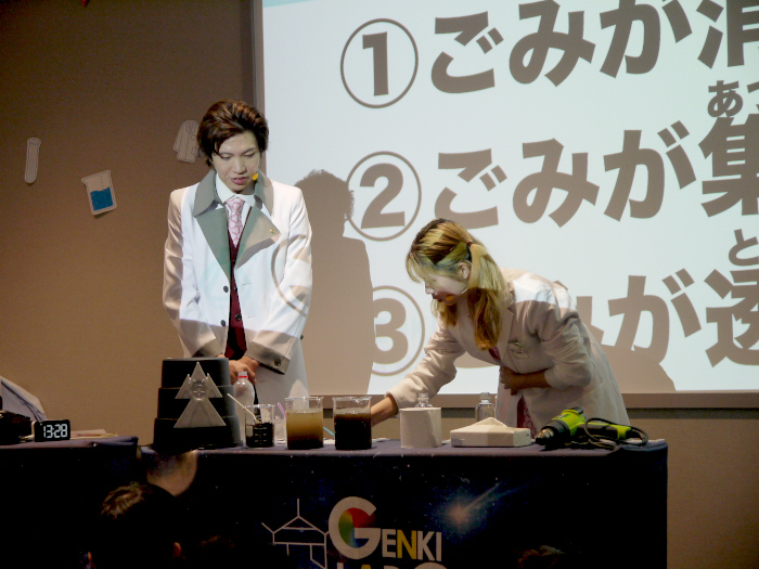 ライブでは、下水道に関する実験をクイズを交えて実施。汚れた水をきれいにしたり、熱湯を流すと下水道管がどうなってしまうかなど、下水道のことについて楽しく学べる内容となっていた。