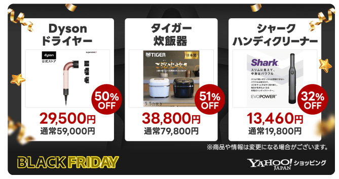 また、50%OFF以上を含むセールブラックフライデー特別商品を展開。Dysonドライヤー、タイガー炊飯器やシャークハンディクリーナーなどの家電、食品、日用品を中心に50%OFF以上の商品も販売予定。商品ラインアップは、順次公開予定となっている。さらに、3万円以上(税込)で誰でも使える「1500円OFFクーポン」などを配布する。