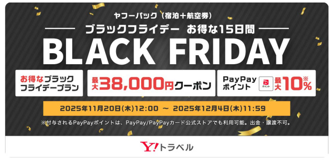 Yahoo!トラベルでは、ヤフーパックブラックフライデーセールとして、宿泊施設と航空券を自由に組み合わせられる「ヤフーパック」で、セール対象の国内宿泊施設を期間限定のお得な価格で提供する。人気の宿泊施設をお得に予約できる限定プランが多数登場予定となっている。JAL限定・ANA限定クーポンとして、最大3万8000円割引となる「限定クーポン」を配布する。PayPayポイント+5%お得キャンペーンとして、ヤフーパックの旅行プランにおいて、旅行代金の5%分の「PayPayポイント」を追加付与する。LYPプレミアム会員なら最大10%分の「PayPayポイント」がもらえる。年末年始や春休みの旅行など、この機会にお得な旅を選んでほしいとのこと。詳細は後日発表する。