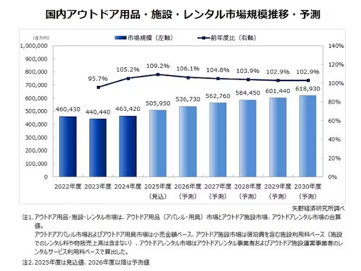 矢野経済研究所、アウトドア用品・施設・レンタル市場に関する調査、2025年度は前年度比9.2%増と5059億5000万円に拡大