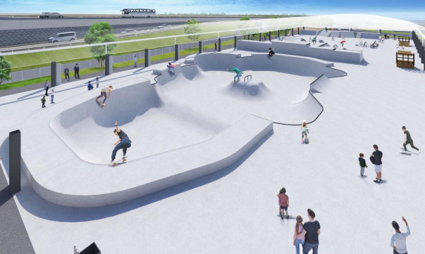同公園は、新設の公園としては県内で初めて公募設置管理制度(Park-PFI)を活用した総合公園。国内外の大会の開催にも対応可能な本格的なスケートパークをはじめ、3x3バスケットボールなどのスポーツや多様なイベントに対応できる屋根付き多目的広場、ゆとりある芝生広場などを備え、子どもから高齢者まで幅広い世代の人が楽しめる施設となる。