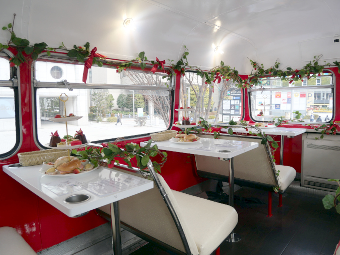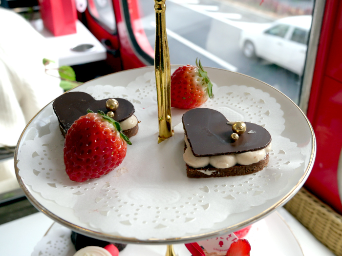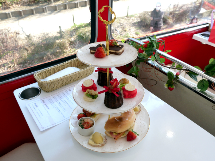 バスの車内では、「いちごさん」を使ったスイーツとセイボリーで構成される3段スタンドのアフタヌーンティーメニューを提供する。スイーツは、「いちごさん」、「ストロベリーチョコレートカヌレケーキ」、「ハートキャラメルクッキータルト」、「テディマカロン」の4品。
