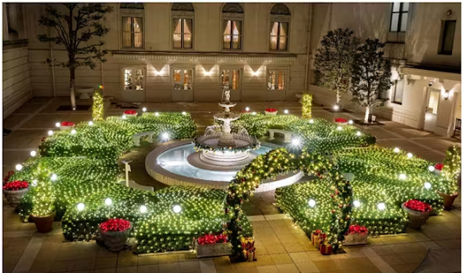 中央に噴水を配した緑あふれるヨーロッパ調の美しい庭園で、合計1.5万球の煌めくイルミネーションに包まれるロマンティックな空間を楽しめる。12月25日までの期間は、光のアーチやギフトボックスなど、クリスマス仕様にアレンジした「光の庭園」を楽しめる。また、タワー館フロント前のロビーでは、煌めきのある森と街並みを表現した物語のような世界観あふれる「クリスマスツリーデコレーション」を設置、今年のホリデーシーズンのテーマ「Brilliant Holiday」をイメージした、この時期ならではの光や輝きに満ちた演出で消費者を迎える。ホテルで過ごすひとときが、明るく輝きに満ちた笑顔溢れる一日となるよう願いを込めた夢のような演出を、どうぞゆっくりと楽しんでほしい考え。