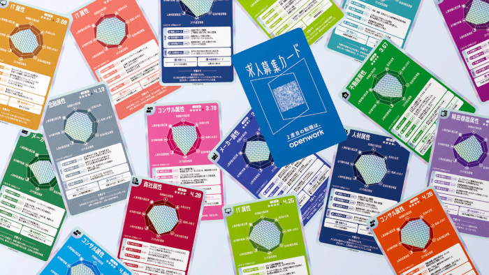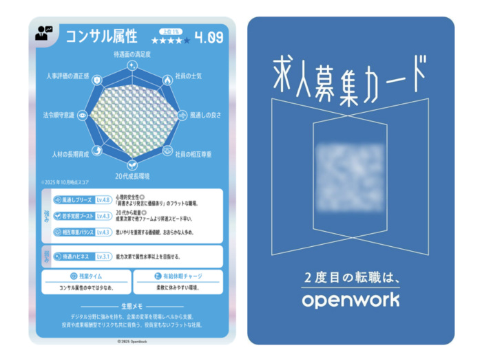 同広告は、OpenWorkに投稿された社員・元社員が考える企業の「強み」や「弱み」が書かれたカード型の求人票をピールオフできる広告で、OpenWorkが保有するクチコミや評価といった膨大なデータをもとに“リアルな企業の姿”をカードとして見える化した。カードには、企業名や給与といった就職や転職にとって重要な情報はあえて伏せている。先入観にとらわれず、企業の強みや弱みをフラットに捉えることで、ゲームのように楽しみながらも自分に合う会社を考えるきっかけになるようなデザインにしている。