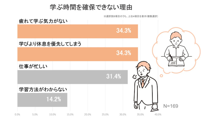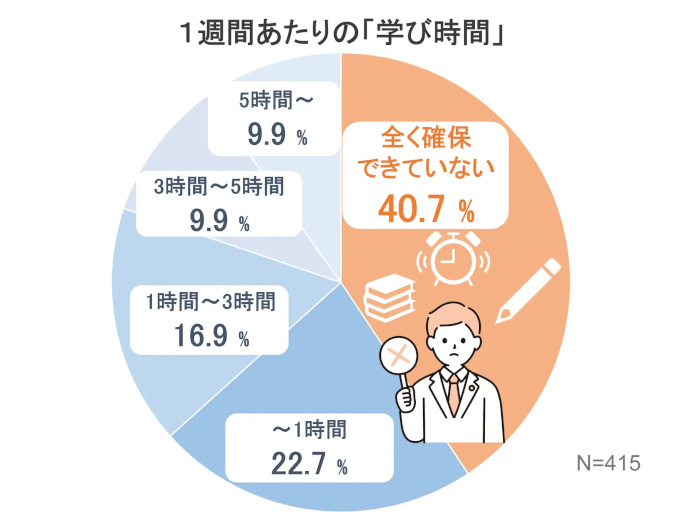 全国の20~60歳のビジネスパーソン415名を対象に、日々の“学び”に関する実態を調査した結果、「日常生活の中で、『学びのための時間』をどの程度確保できているか」では、4割以上(40.7%)が「全く確保できていない」と回答し、学び時間の不足している傾向が見られる結果になった。一方、「学びとして関心があること」では「健康・メンタルケアに関する知識(31.8%)」「資格取得のための勉強(27.2%)」「教養・読書などのインプット(26.3%)」が上位となったが(「資格取得のための勉強」、「コミュニケーションスキル(対人力・話し方など)」、「リーダーシップ・マネジメントスキル」、「語学(英語など)」、「最新トレンド(IT/AI/経営など)の知識習得」、「健康・メンタルケアに関する知識」、「教養・読書などのインプット」、「その他」から複数選択可能方式)、「疲れて学ぶ気力がないから(34.3%)」「学びより休息を優先してしまうから(34.3%)」など疲労が主な要因となり、学びの時間の確保が阻まれている様子が明らかになった。