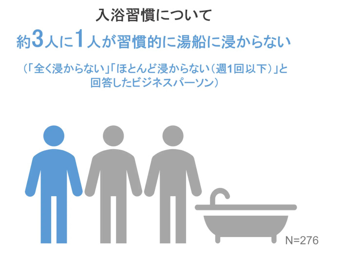 “疲労”が要因となり、学びの時間確保が阻まれている実態を受け、寒さが厳しくなる時期を見据え「冬場の疲労と入浴習慣」に関する調査を実施したところ、約7割(66.5%)のビジネスパーソンが冬の寒さによる疲労について「感じる(26.0%)」または「たまに感じる(40.5%)」と回答した。さらに、「感じる」「たまに感じる」と回答した人に、普段湯船に浸かる頻度を尋ねたところ、「ほとんど浸からない(週1回以下)」が19.9%、「全く浸からない」が12.3%となり、約3人に1人(32.2%)が習慣的に湯船に浸かることが非常に少ないことが明らかになった。その理由としては「光熱費が気になるから(50.6%)」「シャワーで十分だから(49.4%)」「準備や片付けが面倒だから(39.3%)」が上位に挙げられた(「あなたは普段、湯船に浸かるか」に対して、「ほとんど浸からない」、「全く浸からない」と回答した人を対象に実施。「忙しくて浸かる時間が取れないから」「準備や片付けが面倒だから」、「光熱費が気になるから」、「湯船に浸かる習慣がもともとないから」、「シャワーで十分だから」、「その時間で他のことをしたいから(睡眠や娯楽等)」、「その他」から複数選択可能方式)。これらの結果から、冬は寒さによる疲労を感じやすいにもかかわらず、入浴が十分に重視されていない傾向が明らかになった。