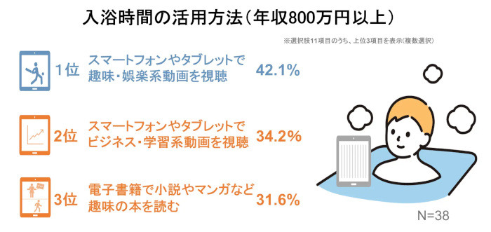 入浴時間の活用でも同様の傾向が見られ、入浴中の時間を週2回以上「身体を温める・身体を洗う」以外に使っている人の全体の結果は18.1%に対し、年収800万円以上の層は23.5%と平均を上回った(「入浴中の時間を入浴の本来の目的(体を温める・身体洗うなど)以外に活用している人に聞いた。その時間を自身の学びのために活用しているか」という質問に対して、「よく活用している(週4回以上)」「たまに活用している(週2~3回程度)」と回答した人の合計値の年収別の結果)。なかでも入浴中の時間の使い方として年収800万円以上の層は、「スマートフォンやタブレットでビジネス・学習系動画を視聴」というインプット・学習に関する行動が34.2%(全体での結果は26.7%)という結果になり、約3人に1人に達していた(「入浴中の時間を入浴の本来の目的(体を温める・身体洗うなど)以外に活用しているか」に対して、「よく活用している」、「たまに活用している」と回答した人を対象に実施。「紙の本でビジネス書・実用書などの本を読む」、「紙の本で小説やマンガなど趣味の本を読む」、「電子書籍でビジネス書・実用書などの本を読む」、「電子書籍で小説やマンガなど趣味の本を読む」、「スマートフォンやタブレットでビジネス・学習系動画を視聴」、「スマートフォンやタブレットで趣味・娯楽系動画を視聴」、「オーディオブック・音声コンテンツ(ビジネス・学習系)を聴く」、「オーディオブック・音声コンテンツ(小説・娯楽系)を聴く」、「SNSやニュースアプリでビジネス・時事情報をチェック」、「SNSやニュースアプリで趣味・娯楽情報をチェック」、「その他」から複数選択可能方式)。