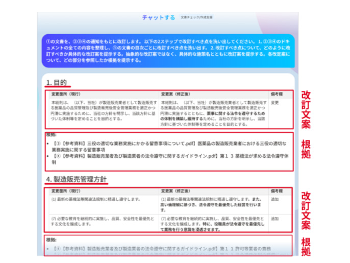 「文書チェック・作成支援」機能のユースケースとしては、製薬企業では、薬機法改正や厚労省通知に対応する社内規定改訂を迅速化できる。法改正や行政通知、新ガイドライン発出に際し、品質文書との整合性を短時間で点検。差分抽出と改訂案生成によって、薬制・QA部門の対応スピードと精度を向上する。また、GMP省令(医薬品および医薬部外品の製造管理および品質管理の基準に関する省令)の改正時に、関連する手順書・SOP・作業標準書などの文書をAIが比較。改訂が必要な箇所と根拠条文を網羅的に提示し、品質保証部門での改訂作業を効率化する。