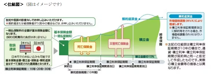 特徴は、取扱通貨を米ドル・日本円から、積立利率保証期間を10年・20年・30年からお選ぶことができる(契約年齢等によって選べる積立利率保証期間には、所定の制限がある)。告知や診査なしで申込みできる(契約年齢範囲:米ドル5歳~90歳、日本円0歳~90歳)。契約日の積立利率を積立利率保証期間にわたり適用し、指定された通貨建の一時払保険料が積立金額として複利で増加する。積立利率保証期間更改日には、積立利率が新たに設定される。また、通貨(米ドルから日本円の変更のみ可能)・積立利率保証期間を変更できる。保障は一生涯継続し、万一のときには保険金を支払う。