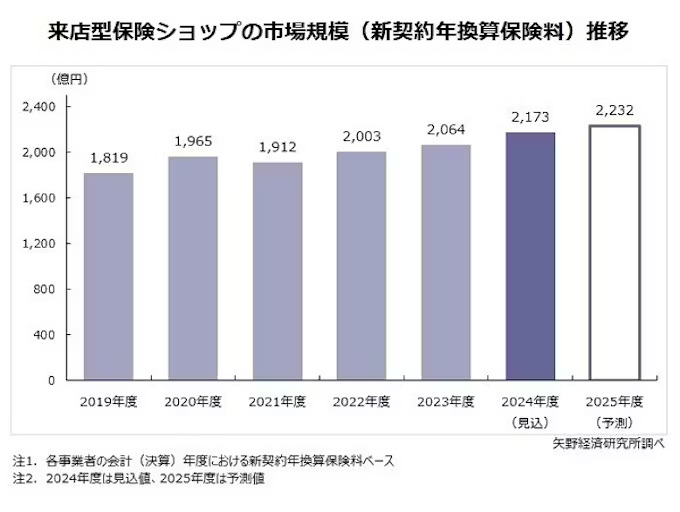 矢野経済研究所、生命保険の販売チャネルに関する調査、2024年度の来店型保険ショップ市場規模は2173億円に拡大見込