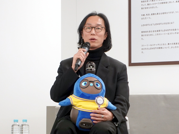 「人の潜在能力を引き出すロボットは3ヵ月で飽きてしまうという“壁”が存在している。しかし、LOVOTは飽きの壁を突破、ユーザーの90%が3年以上継続利用している」と、飽きられることなく利用されていると力説する。「この要因として挙げられるのが、神経系で、犬の研究(麻布大学 菊永健史教授の研究など)から明らかになったヒトが絆を構築する条件から愛着形成していくことに着目し、LOVOTの神経系を構築していった」とのこと。「この機能を主眼にし、デザインの本質を守りながらLOVOTは継続的に進化をしてきた」と、これまでにない高性能を実現した家族型ロボットに発展したのだという。「また、LOVOTは運動能力よりも認知能力にフォーカス。クラウドではなくローカルでデータ処理を行うことで、信頼が愛着を生み、3年後も90%という高い継続率を実現している」と述べていた。