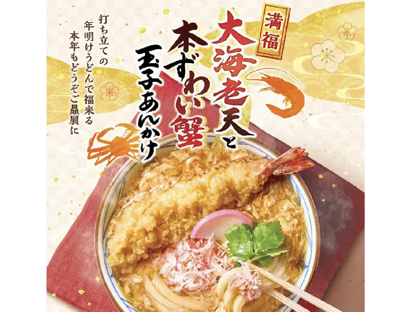 丸亀製麺、えびと蟹の豪華な食材を打ち立てうどんに絡めて楽しむ「大海老天と本ずわい蟹の玉子あんかけうどん」を新春限定販売