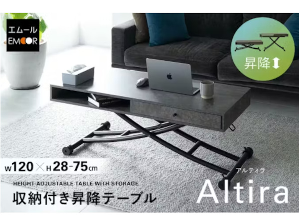 エムール、高さ昇降機能に引き出し・オープン収納を備えた収納付き昇降テーブル「Altira(アルティラ)」を発売