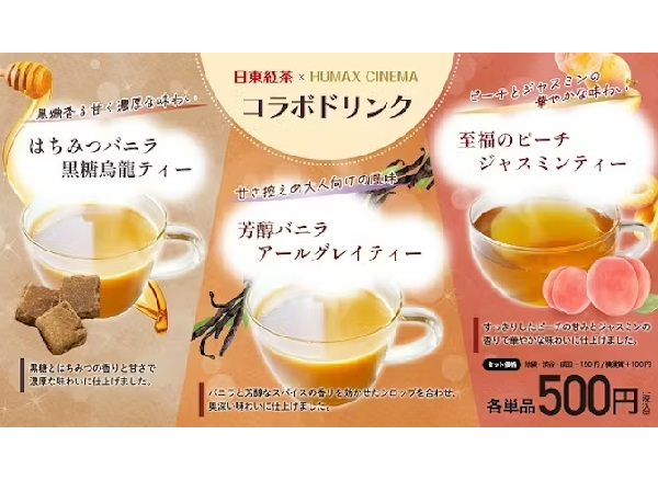 三井農林、日東紅茶が映画館ヒューマックスシネマとコラボし「はちみつバニラ黒糖烏龍ティー」など3種のコラボドリンクを発売