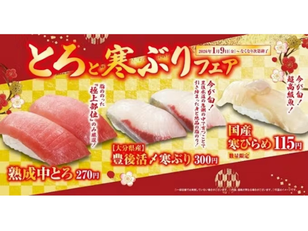 くら寿司、冬が旬の寒ブリ・寒ヒラメを豪華に味わう「とろと寒ぶり」フェアを期間限定で開催