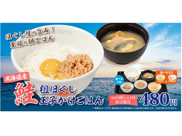 松屋フーズ、「松屋」で午前5時~午前11時の朝食メニューに「北海道産鮭の粗ほぐし玉子かけごはん」を販売