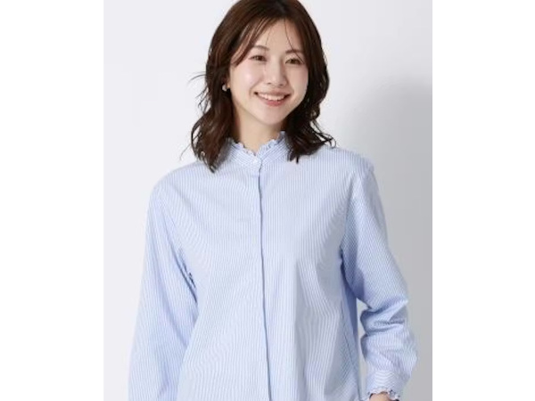 青山商事、仕事やプライベートのシーンに合わせてスタイルを切り替えられる「4WAYバンドカラーフリルブラウス」を発売